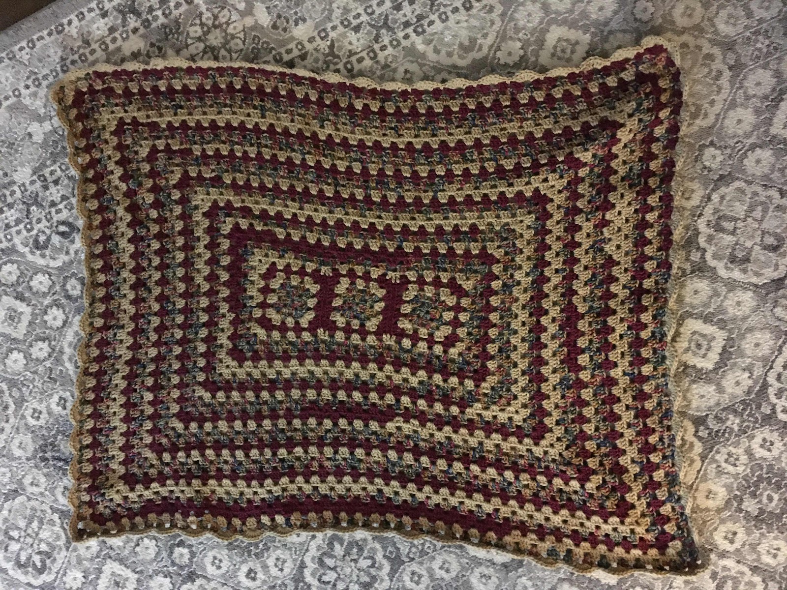 The wheelchair blanket is finished, but not washed and blocked yet. I just used scraps from my stash and I'm really happy with it. The tan and burgandy match the varigated yarn perfectly. That's always nice when it happens so nicely.