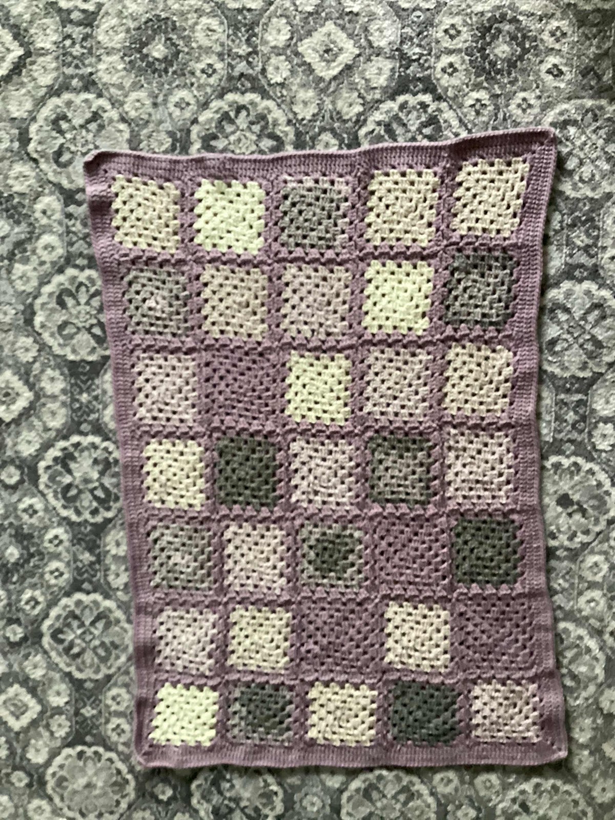 On to happier things. I finished another wheelchair blanket for the facility Mom lives in. I think the colors together turned out well together.