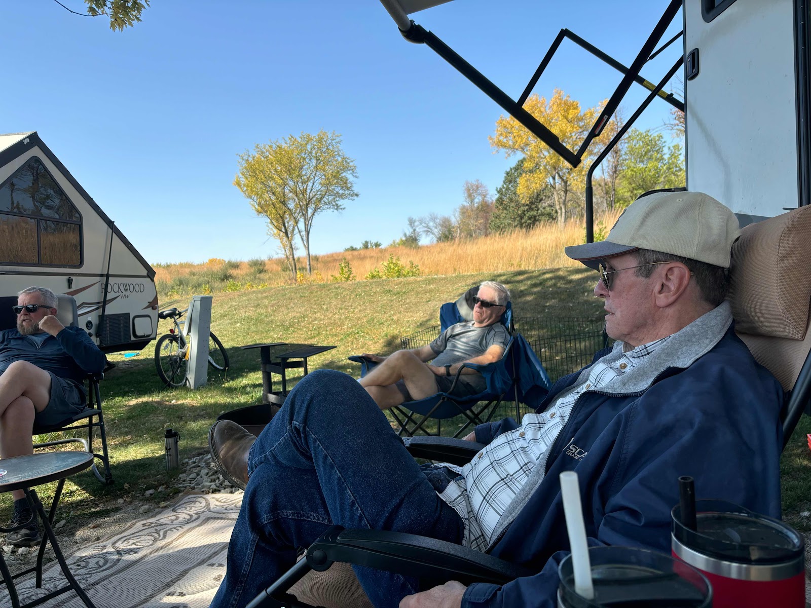 Last week we went to Lake Anita State Park in Iowa for 4 days with our cousins and great friends, Curt and Barb and our pastor and his wife, Jeff and Angie. To say we had a wonderful time would be an understatement. The weather was sismply amazing and a true gift from the Lord. See that blue sky? It was like that the entire time. The leaves were beginning to change and we had cool, (cold) nights and nippy days with just enough warmth to be enjoyable. We were very grateful for our heaters during the night. This is what we did a LOT of. Talking and relaxing and eating. Eating a LOT! :-) From left to right, Jeff, Curt and Dennis. We all take the responsibility for various meals and then we all chip in for "extra's." So much FUN!